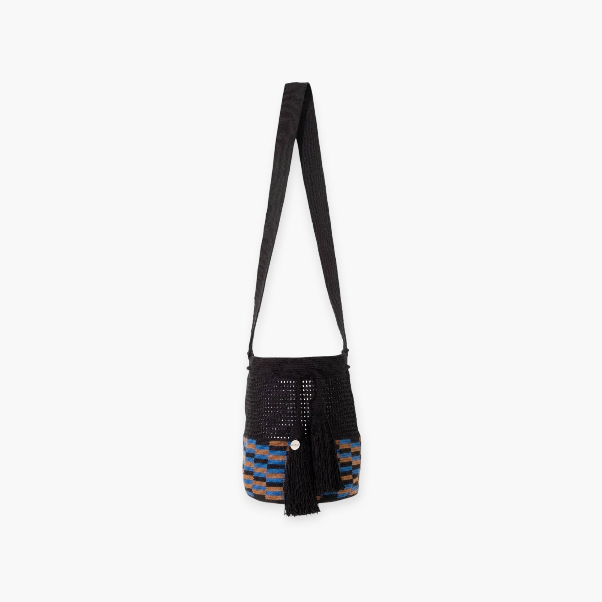 Add artisanal flair to your outfits with the check net crossbody bag. Woven into a round shape in a timeless yet modern motif. The crossbody features a woven net-like upper body and is completed with a crossbody strap, drawstring closure and matching tassels. A relaxed shape sized for a day on-the-go.